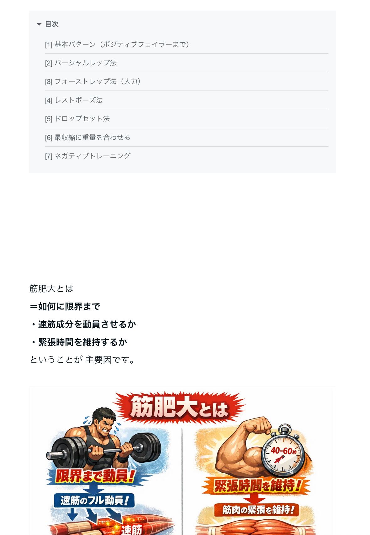 内容は、食事管理からトレーニングの具体的なテクニック、モチベーションの維持に至るまで、多岐にわたります。筋肥大に必要な栄養素や、その取り入れ方についても詳しく説明しています。理論だけでなく、実践に役立つポイントが盛りだくさんです!